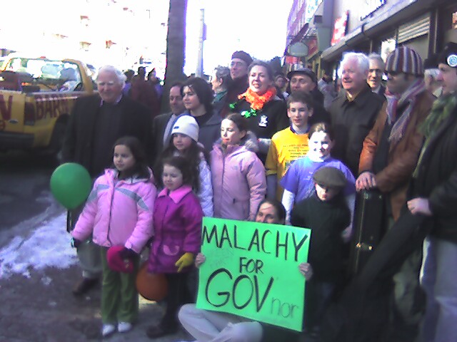 Green Party governor candidate hopeful Malachy McCourt (left) and his brothers led the alternative St. Patricks’ Day parade in Queens  (Kimberly is holding the sign). http://www.malachymccourt.com/