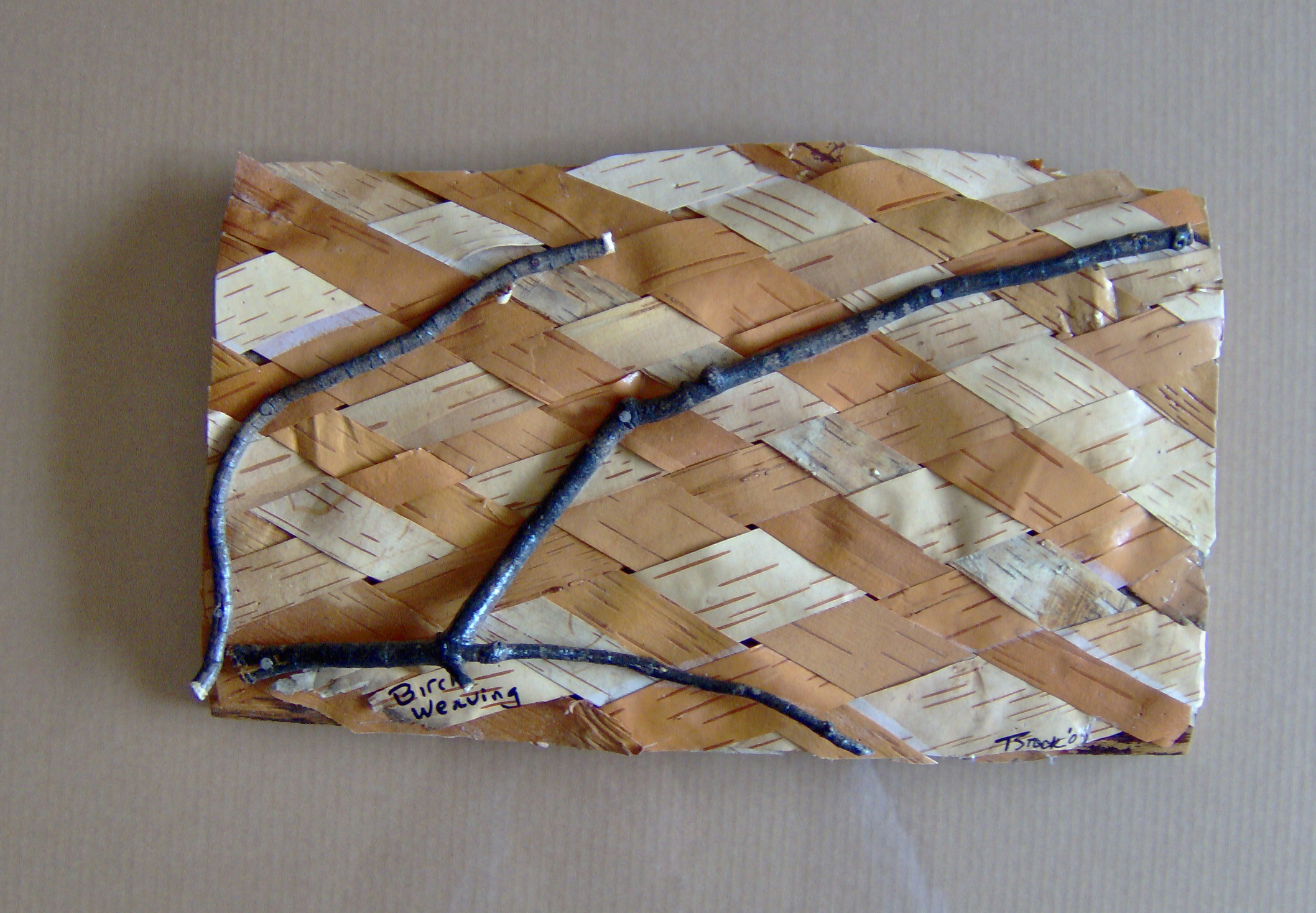 The art piece above is Birch Weaving by Manorville naturalist/puppeteer/farmer/artist Tom Stock. It is mounted on a curved piece of wood. The weaving is made from Adirondack Birch Bark that naturally peels off the trees. It measures 8″ x 14″.