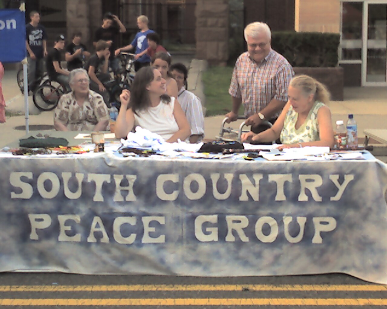 At a Patchogue street festival, the South Country Peace Group had a table with peace literature and counter-recruiting information. On the far right is Susan McKeon-Steinmann.