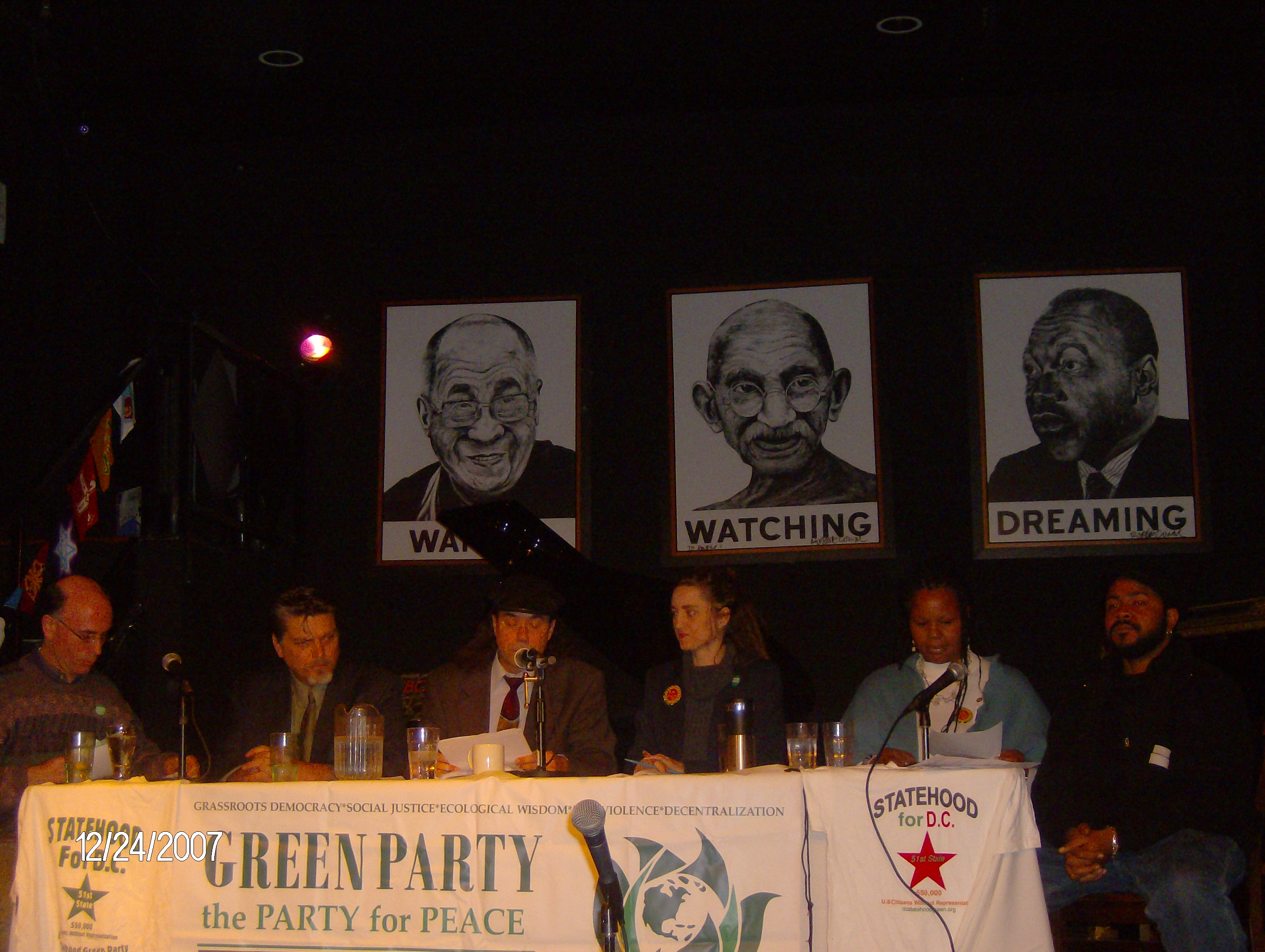 Note: Thanks to someone in D.C. whose name I forgot who sent the photo along months ago when the D.C. Statehood Green Party held their presidential forum. The photo includes some of the Green Party presidential candidates, and some of the speakers for the evening.