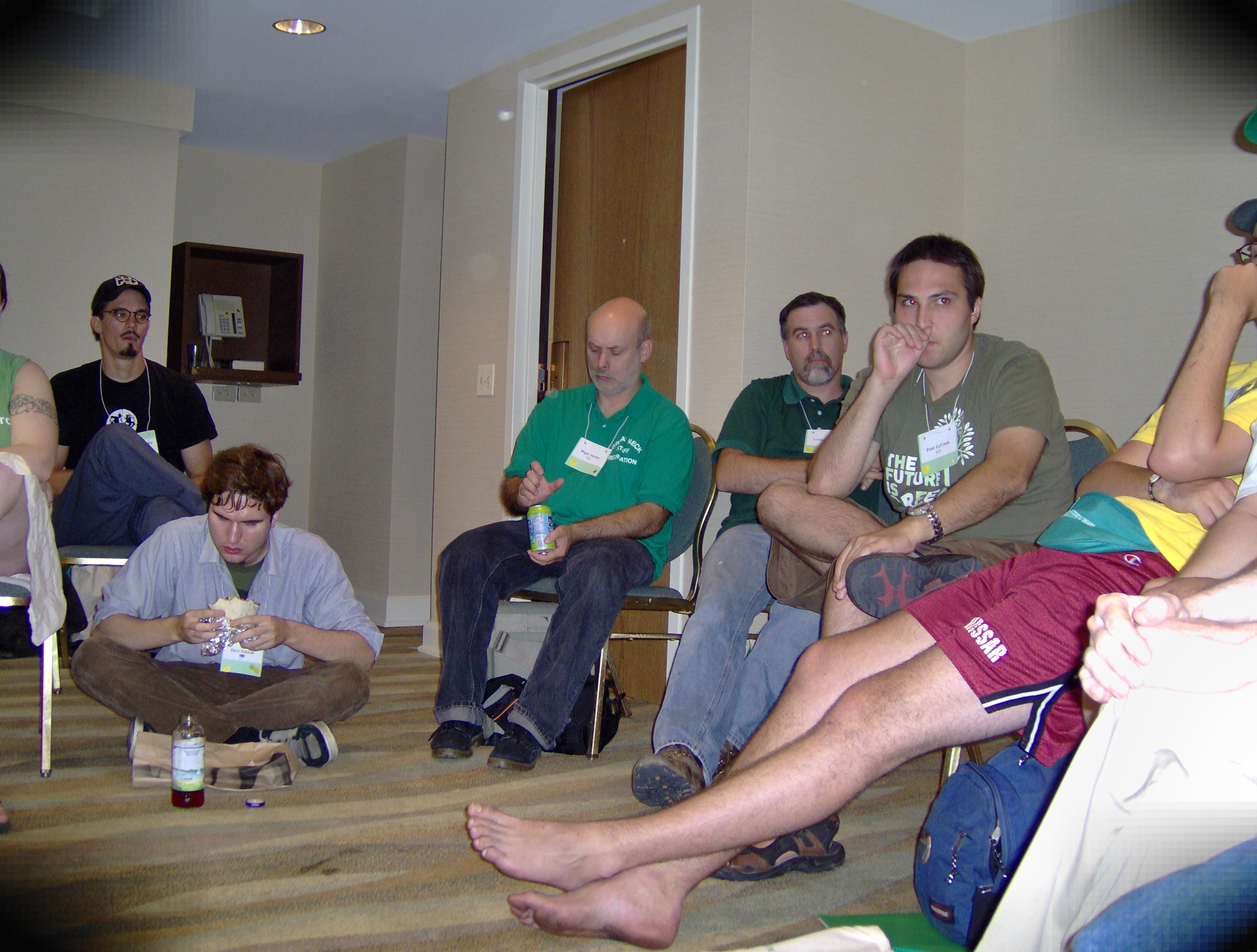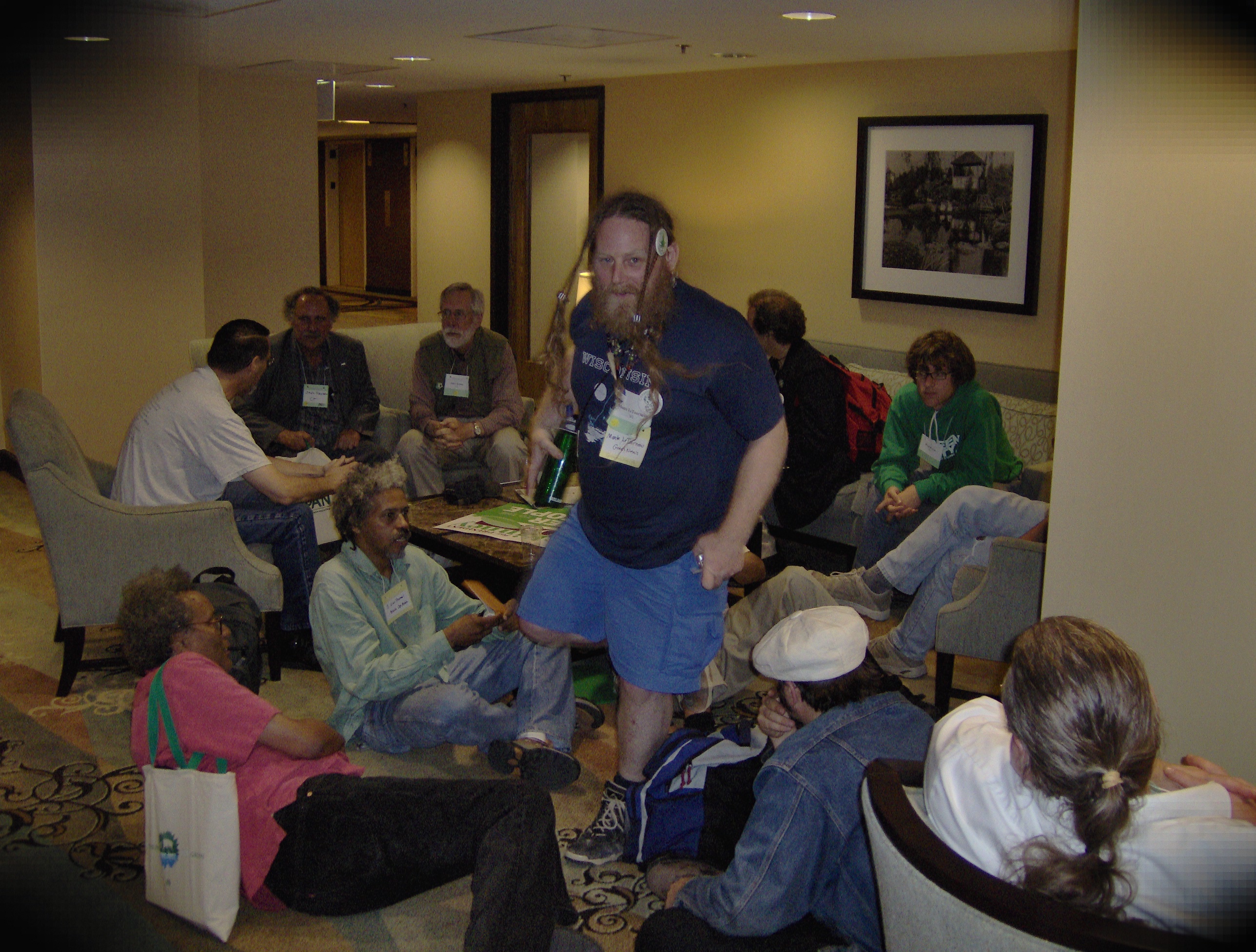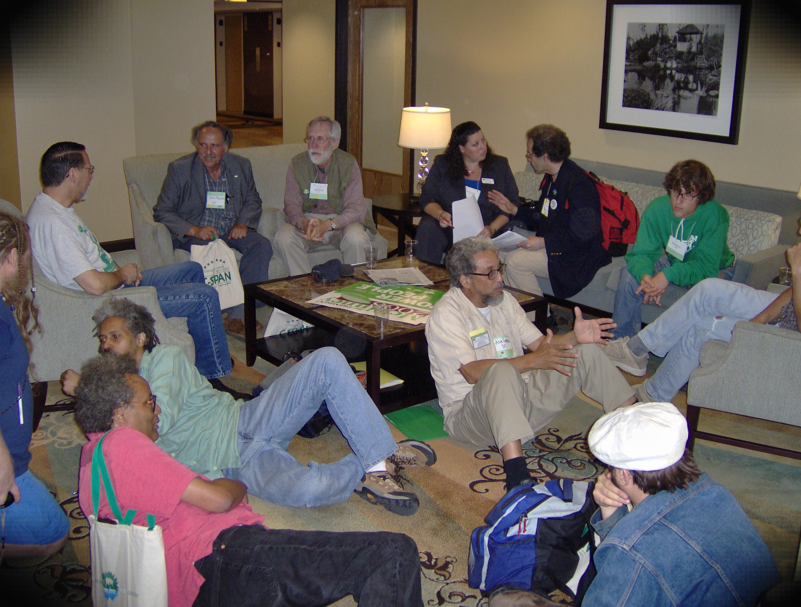 Greens in hallway of hotel networking: Asa Gordon seated on floor in khaki pants, Nikilhananda of Hawaii in gray jacket on couch