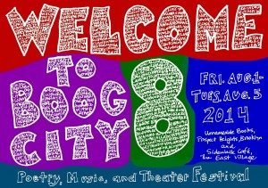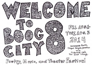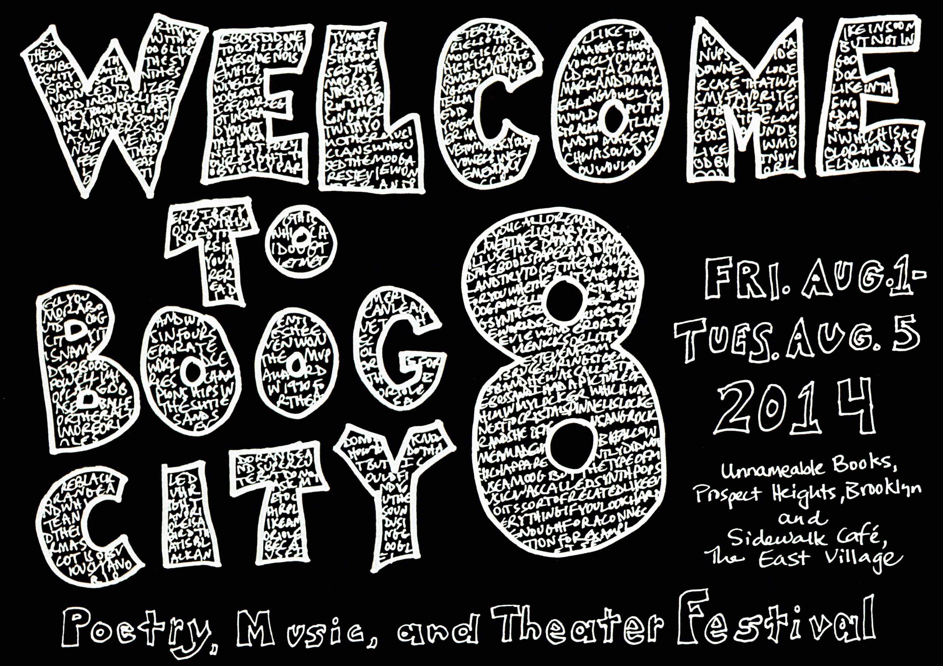 In just over five weeks from now, from Fri., Aug. 1 through Tues. Aug. 5, 2014, Boog will be celebrating its 23rd anniversary by putting on the eighth annual Welcome to Boog City poetry, music, and theater festival. It will feature 66 poets, 16 musical acts, 9 poets theater plays, 2 poets in conversation with one another, 1 political talk, 1 d.a. levy lives visiting press, and 1 panel over the five days.