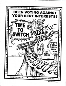 Jill Stein and other Green Party candidates are running on a platform that will put millions of Americans to work and restore economic stability by combatting global warming with new jobs in conservation, developing new and safe energy technologies, retrofitting buildings and homes and redesigning public infrastructure for energy efficiency, expanding public transportation to reduce car traffic, a carbon tax as an incentive to promote safe and clean energy, and other ideas. Obama and Romney keep talking about independence from foreign oil. The real problem is America’s addiction to fossil fuels, regardless of where they come from. Only Dr. Stein is offering solutions.