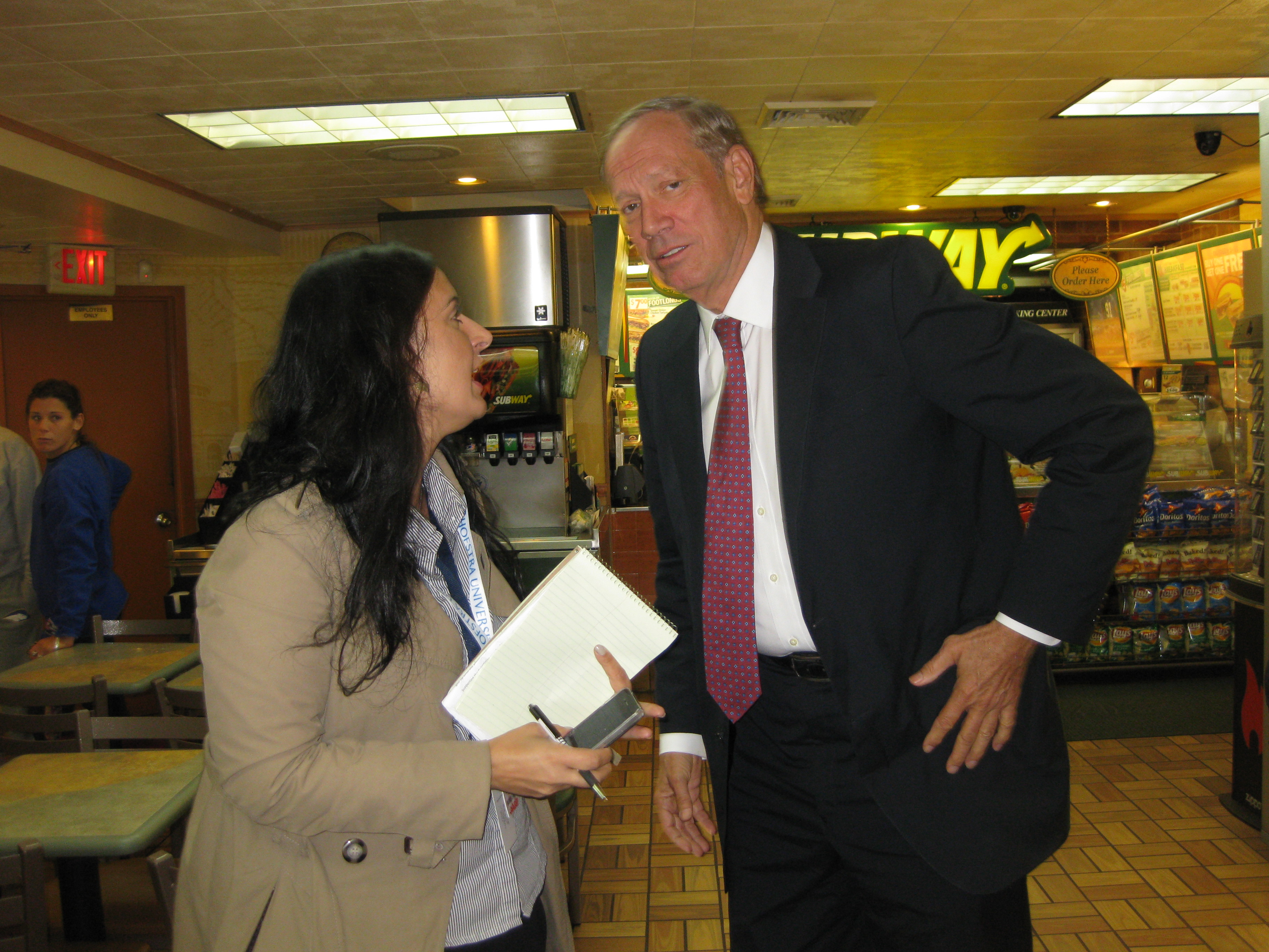 Oh yeah, dinner with the governor. We walked into the Subway on the edge of Hofstra campus for a quick bite. I instantly recognized former NY Governor George Pataki sitting at a table eating a sandwich. Rather surreal. I, of course was wearing a Green Party sweatshirt. The Governor must have noticed because he nodded to me when I came in. We left him alone to eat. As he was leaving, I rose to ask to take a picture. Some of the people in the restaurant did not realize who he was until they heard me address him as Governor.