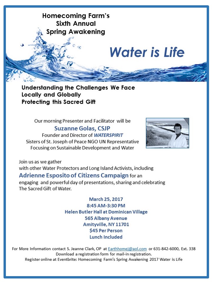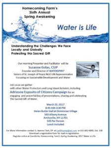 Homecoming Farm will be offering its Sixth Annual Spring Awakening as a gathering for those who care about the future of our Earth. This year’s program is entitled “Water is Life: Understanding the Challenges We Face Locally and Globally Protecting this Sacred Gift” The event takes place on March 25, 2017 from 8:45 am – 3:30 pm at Helen Butler Hall at Dominican Village, 565 Albany Avenue, Amityville, NY 11701. Registration is required at $45 per person which includes lunch.